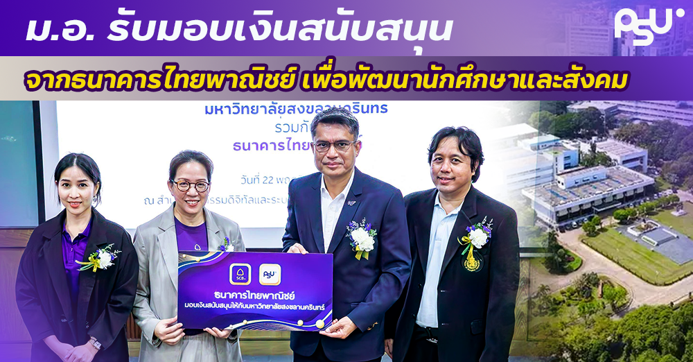 มหาวิทยาลัยสงขลานครินทร์ โดย สำนักนวัตกรรมดิจิทัลและระบบอัจฉริยะ จัดพิธีรับมอบเงินสนับสนุนการพัฒนานักศึกษาและสังคม จากธนาคารไทยพาณิชย์ โดยมี รศ. ดร.วศิน สุวรรณรัตน์ รองอธิการบดีวิทยาเขตหาดใหญ่ เป็นประธานเปิดงาน พร้อมด้วย คณะผู้บริหาร และบุคลากรของทั้งสองหน่วยงานเข้าร่วม ณ สำนักนวัตกรรมดิจิทัลและระบบอัจฉริยะ มหาวิทยาลัยสงขลานครินทร์ วิทยาเขตหาดใหญ่ เมื่อวันที่ 22 พฤศจิกายน 2567