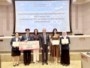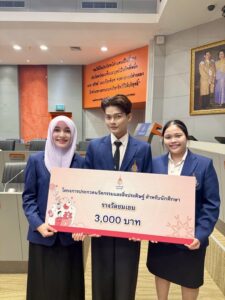 ได้รับรางวัล ชมเชย การประกวดนวัตกรรมและสิ่งประดิษฐ์นักศึกษาระดับปริญญาตรี จัดโดย สำนักบริหารวิจัยและนวัตกรรม ราชวิทยาลัยจุฬาภรณ์
