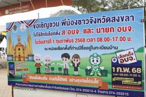 วันที่ 27 มกราคม 2568 ที่บริเวณหน้าศาลากลางจังหวัดสงขลา อ.เมือง จ.สงขลา สำนักงานคณะกรรมการการการเลือกตั้งประจำจังหวัดสงขลา จัดกิจกรรมรณรงค์เชิญชวนออกไปใช้สิทธิเลือกตั้งสมาชิกสภาองค์การบริหารส่วนจังหวัดสงขลาและนายกองค์การบริหารส่วนจังหวัดสงขลา ภายใต้แนวคิด “1 กุมภาพันธ์ สร้างสรรค์ประเทศไทย พร้อมใจไปเลือกตั้ง” เพื่อกระตุ้นให้ประชาชนตระหนักถึงความสำคัญของการเลือกตั้ง ปราศจากการครอบงำ โดยคำนึงถึงประโยชน์ของประเทศชาติเป็นสำคัญ โดยมี นายสังคม เกิดก่อ รองผู้ว่าราชการจังหวัดสงขลา เป็นประธานเปิดกิจกรรม พร้อมด้วยพร้อมด้วย ร.ต.อ. สมนึก กุลมณี ผู้อำนวยการสำนักงานคณะกรรมการการเลือกตั้งประจำจังหวัดสงขลา โดยได้ร่วมแสดงท่าทางเชิงสัญลักษณ์ในการหย่อนบัตรเลือกตั้ง 2 ใบ เพื่อเปิดกิจกรรมอย่างเป็นทางการ