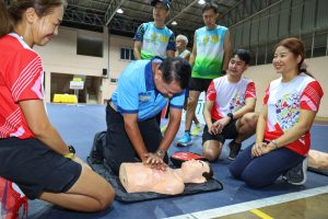 ซึ่งเครื่อง AED นี้ จะทำการติดตั้งไว้บริเวณหน้าอาคารสนามฟุตซอล หากเกิดเหตุผู้มาออกกำลังกายมีภาวะหัวใจหยุดเต้นเฉียบพลัน สามารถนำเครื่องนี้มาช่วยเหลือบ้างต้นได้ทันท่วงทีก่อนนำส่งโรงพยาบาลต่อไป ในการนี้ทางชมรมวิ่งหาดใหญ่ได้รับความอนุเคราะห์จากโรงพยาบาลหาดใหญ่ ส่งแพทย์และพยาบาลมาสาธิตวิธีการใช้เครื่อง AED ให้กับประชาชนที่มาร่วมออกกำลังกาย ให้รู้หลักวิธีการใช้และวิธีช่วยเหลือแก่สมาชิกที่ประสบเหตุในการออกกำลังกายในครั้งนี้ด้วย