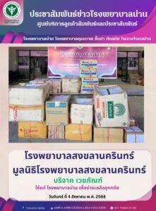วันที่ 4 สิงหาคม 2568 นพ.วสันต์ แก้ววี ผู้อำนวยการโรงพยาบาลน่าน และ ทพญ. สุรีรัตน์ สูงสว่างรองผู้อำนวยการ โรงพยาบาลน่าน ด้านกิจการพิเศษ งานประชาสัมพันธ์ พร้อมด้วยบุคลากรโรงพยาบาลน่าน ร่วมรับมอบเวชภัณฑ์ทางการแพทย์ที่จำเป็น จากโรงพยาบาลสงขลานครินทร์ และมูลนิธิโรงพยาบาลสงขลานครินทร์ ที่จัดส่งไปเพื่อร่วมช่วยเหลือและบรรเทาความเดือดร้อนจากสถานการณ์อุทกภัย ชาวสงขลานครินทร์ ขอเป็นกำลังใจโรงพยาบาลน่านและชาวน่าน ผ่านพ้นวิกฤตครั้งนี้โดยเร็ว