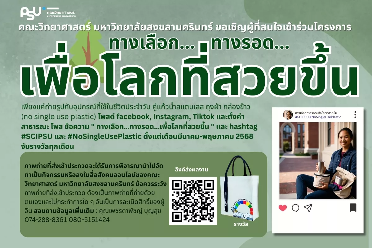 วันพฤหัสบดีที่ 3 เมษายน พ.ศ. 2568 ได้มีการจัดกิจกรรมมอบรางวัลถุงผ้าให้แก่ผู้ร่วมสนุกในกิจกรรม “ทางเลือก… ทางรอด… เพื่อโลกที่สวยขึ้น” โดยมีการร่วมสนุกผ่านการโพสต์รูปภาพคู่กับอุปกรณ์รักษ์โลก เช่น แก้วน้ำสแตนเลส ถุงผ้า หรือกล่องข้าว พร้อมใส่ข้อความ “ทางเลือก… ทางรอด… เพื่อโลกที่สวยขึ้น” และติดแฮชแท็ก #SCIPSU #NoSingleUsePlastic ตั้งค่าโพสต์เป็นสาธารณะ ซึ่งตลอดเดือนมีนาคมที่ผ่านมา มียอดผู้ร่วมกิจกรรมกว่า 50 คน โดยทุกท่านได้รับรางวัลเป็นถุงผ้ารักษ์โลกจากคณะวิทยาศาสตร์ ม.อ.