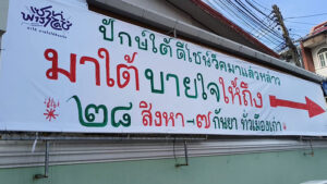 โดยทางวัดได้ขึ้นป้ายประชาสัมพันธ์งานเป็นภาษาถิ่น มีข้อความว่า “ปักษ์ใต้ ดีไซน์วีค มาแล้วหล่าว มาใต้ บายใจ ให้ถึง หวัน ๒๘ สิงหา – ๗ กันยา ทั่วเมืองเก่า”