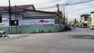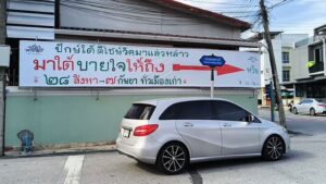 ซึ่งเป็นป้ายผ้าสีขาว ขนาดกว้าง 1 เมตร ยาว 6 เมตร ติดบนกำแพงวัด บริเวณสี่แยกไฟแดงถนนสายบุรีตัดถนนไทรบุรี สามารถมองเห็นได้อย่างเด่นชัด เนื่องจากเขียนตัวหนังสือสีแดงและสีน้ำเงินตีวโตๆ อีกทั้งมีลูกศรสีแดง ชี้ยาวไปถึงหวัน ที่เป็นจุดเด่น ทำให้รถที่วิ่งผ่านไปผ่านมาบริเวณสี่แยกไฟแดงแห่งนี้ ขณะติดไฟแดงก็ต้องหันไปมองและอ่านข้อความที่ทางวัดขึ้นป้ายแจ้งข่าวชาวบ้านว่าอย่างไร และจะต้องอ่านทุกครั้ง หากวัดเลียบสงขลาขึ้นป้ายบอกบุญชาวบ้าน