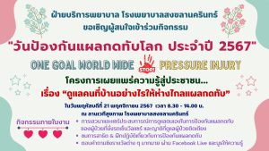 ฝ่ายบริการพยาบาล โรงพยาบาลสงขลานครินทร์ ขอเชิญผู้สนใจเข้าร่วมกิจกรรม “วันป้องกันแผลกดทับโลก ประจำปี 2567” โครงการเผยแพร่ความรู้สู่ประชาชน…เรื่อง “ดูแลคนที่บ้านอย่างไรให้ห่างไกลแผลกดทับ” วันพฤหัสบดีที่ 21 พฤศจิกายน 2567 เวลา 8.30 – 14.00 น. ณ ลานเวทีสุขภาพ โรงพยาบาลสงขลานครินทร์