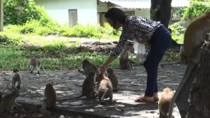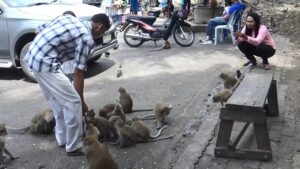 ในวันนี้มีนักท่องเที่ยวนำลองกอง 2 ถุงใหญ่ มาเดินแจกจ่ายให้กับฝูงลิงได้กินกันอย่างทั่วถึงซึ่งตามปรกติลิงที่นี่จะได้กินกล้วยและข้าวโพดที่มีขายอยู่ตามร้านค้าเท่านั้น สำหรับลองกองนักท่องเที่ยวนำใส่รถมาเอง ซึ่งเป็นที่ชื่นชอบของลิงเป็นอันมาก เดินแจกจ่ายให้ลิงแทบไม่ทันและหมดภายในเวลาอันรวดเร็ว ลิงจะแกะลองกองกันเหมือนคน แกะเปลือกกินเฉพาะเนื้อเม็ดคายทิ้ง ลิงแต่ละตัวกินลองกองอย่างตั้งใจ เนื่องจากเนื้อลองกองมีรสชาติอร่อย