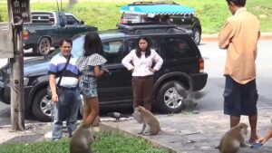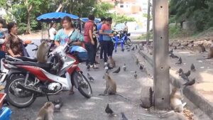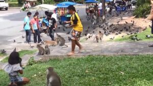วันหยุดสุดสัปดาห์ นกพิราบและลิงเขาน้อยเขาตังกวนอิ่มเอมถ้วนหน้า หลังนักท่องเที่ยวเดินทางมาท่องเที่ยวที่แหลมสมิหลาสงขลา แวะมาเที่ยวชมฝูงลิงและฝูงนกพิราบที่บริเวณเชิงเขาตังกวน โดยซื้ออาหารให้ลิงและนกกิน เพื่อเป็นการทำบุญแจกทานให้กับสัตว์ถือเป็นการสร้างบุญสร้างกุศลให้กับตนเอง