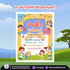 จังหวัดสงขลาเชิญร่วมงานวันเด็กแห่งชาติ ประจำปี 2568   ขอเชิญชวนเด็ก ๆ และผู้ปกครองร่วมกิจกรรมวันเด็กแห่งชาติ ณ สถานที่ต่าง ๆ ในจังหวัดสงขลา เพื่อเสริมสร้างความสุข สนุกสนาน และพัฒนาทักษะการเรียนรู้ในรูปแบบที่หลากหลาย