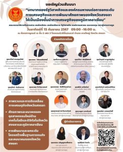 วันที่ 15 กันยายน 2567 นายทรงพล จังศิริวัฒนธำรง ประธานหอการค้าจังหวัดสงขลา ร่วมเป็นวิทยากรในการสัมมนา เรื่อง “บทบาทขอรัฐวิสาหกิจและองค์การมหาชนต่อการยกระดับทางเศรษฐกิจและการพัฒนาศักยภาพของจังหวัดสงขลาให้เป็นเมืองชั้นนำทางเศรษฐกิจของภูมิภาคเอเซียน” ณ ห้องสราญรมย์ เอ ชั้น2 (เฟส2) โรงแรมนิวซีซันสแควร์ อ.หาดใหญ่ จ.สงขลา