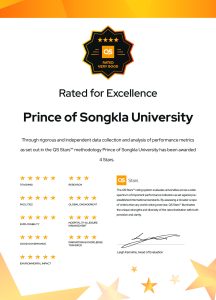 มหาวิทยาลัยสงขลานครินทร์ (ม.อ.) ได้รับการจัดอันดับเป็นมหาวิทยาลัยระดับ 4 ดาว จากการประเมินมหาวิทยาลัย โดย QS Stars Ratings ประจำปี 2025 สถาบันจัดอันดับมหาวิทยาลัยโลกชื่อดัง โดยเฉพาะในด้าน Teaching ด้าน Facilities ด้าน Employability และด้าน Environmental Impact อยู่ในระดับ 5 ดาว
