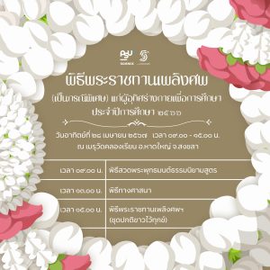 สดุดี. ดวงวิญญาณของอาจารย์ใหญ่ผู้เสียสละยิ่งทุกท่าน คณะวิทยาศาสตร์ ม.อ. ขอเชิญทุกท่านร่วมเป็นเกียรติในงานพิธีร่วมพิธีพระราชทานเพลิงศพ (เป็นกรณีพิเศษ) แก่ผู้อุทิศร่างกายเพื่อการศึกษา ประจำปีการศึกษา ๒๕๖๖ จำนวน ๑๗๓ ร่าง ในวันอาทิตย์ที่ ๒๘ เมษายน ๒๕๖๗ เวลา ๐๙.๐๐ – ๑๕.๐๐ น. ณ. เมรุวัดคลองเรียน อ.หาดใหญ่ จ.สงขลา