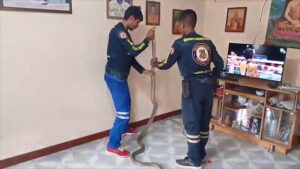 เมื่อไปถึงเจ้าหน้าที่จึงได้เข้าตรวจสอบที่หลังตู้ชั้นวางทีวีก็พบงูจงอางตัวใหญ่นอนขดตัวอยู่หลังตู้ชั้นวางทีวี จึงเข้าใช้มือเปล่าจับงูจงอางแล้วลากออกมา ก่อนจะใช้มือเปล่าๆจับหัวงูจงอางไว้ได้ นำมาวัดได้ความยาวถึง 3.10 เมตร รีบนำใส่กระสอบเตรียมนำไปปล่อยคืนสู่ป่าธรรมชาติที่อยู่ห่างไกลบ้านเรือนผู้คนต่อไปเพื่อความปลอดภัย