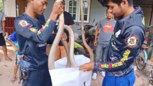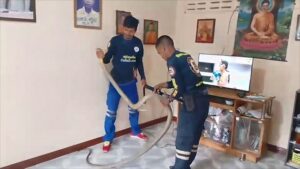 วันนี้ 19 มิถุนายน 2568 น.ส.พิมพ์พา แก้วพันธ์ อายุ 43 ปี อยู่บ้านเลขที่ 83/2 ม.7 ต.สะพานไม้แก่น อ.จะนะ จ.สงขลา ว่าขณะนั่งดู ทีวีอย่างสนุกสนาน ก็ต้องสะดุ้งเมื่อสายตามองไปเห็นงูจงอางตัวใหญ่เลื้อยเข้ามาขอดูทีวีด้วย แล้วมันก็เลื้อยเข้าไปอยู่หลังตู้ชั้นวางทีวี เมื่อตั้งสติได้ จึงรีบประสานไปยังทีมอสรพิษวิทยาภาคใต้ และ ทีมปราบอสรพิษอาสาพิทักษ์งู จ.สงขลา มาช่วยจับงูจงอางให้ที