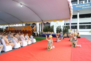 พิธีในวันนี้ได้รับความเมตตาจากพระครูปุญญาภิศาล เจ้าอาวาสวัดพะโคะ เป็นประธานฝ่ายสงฆ์ โดยเริ่มต้นด้วยการแสดงมโนราห์ศิลปะนาฏลีลาโนราห์ศรีวิชัย จากสำนักการจัดการนวัตกรรมและถ่ายทอดเทคโนโลยี มทร.ศรีวิชัย ต่อจากนั้นเข้าสู่พิธีเจริญพระพุทธมนต์ โดยประธานฝ่ายสงฆ์กล่าวสัมโมทนียกถา ในโอกาสนี้ นายโชตินรินทร์ เกิดสม ผู้ว่าราชการจังหวัดสงขลา ได้ถวายจตุปัจจัยไทยธรรมแด่ประธานสงฆ์ จากนั้นผู้บัญชาการทัพเรือภาคที่ 2 พร้อมคณะผู้เข้าร่วมพิธี ได้ร่วมกันถวายจตุปัจจัยไทยธรรมแด่พระสงฆ์ที่เจริญพระพุทธมนต์ และร่วมพิธีกรวดน้ำเพื่ออุทิศถวายกุศล เป็นอันเสร็จพิธี
