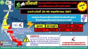 ช่วงวันที่ 27-30 พฤศจิกายน 2567 มีฝนหนักถึงหนักมากหลายพื้นที่ บริเวณจังหวัดนครศรีธรรมราช พัทลุง สงขลา ปัตตานี ยะลา และนราธิวาส ขอให้ประชาชนระวังอันตรายที่เกิดจากฝนตกหนัก ฝนที่ตกสะสม และลมกระโชกแรง ซึ่งอาจทำให้พื้นที่ เสี่ยงภัยเกิดน้ำท่วมฉับพลัน น้ำป่าไหลหลาก น้ำล้นตลิ่ง และดินโคลนถล่มในพื้นที่ลาดเชิงเขา อย่างต่อเนื่อง