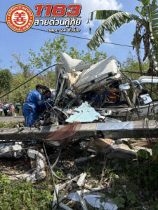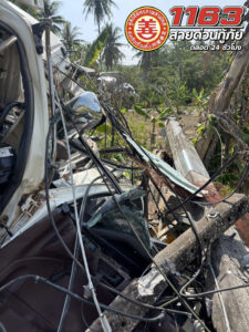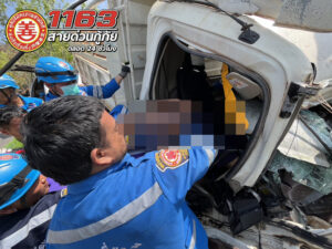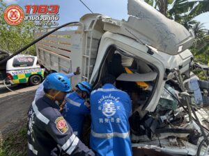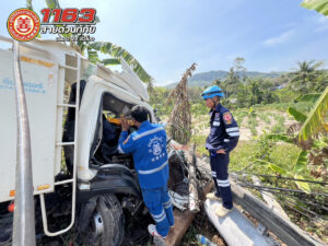 อุบัติเหตุรถบรทุก 6 ล้อ ชนเสาไฟฟ้า มีผู้บาดเจ็บติดภายใน