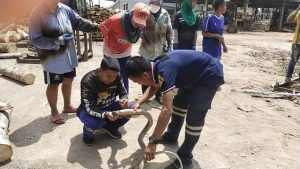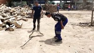 เมื่อนายทวีศักดิ์ พร้อมด้วย นาย อภิชาติ พรหมสงค์ และเจ้าหน้าที่กู้ชีพฯไปถึง ก็เข้าตรวจสอบไซดักปลานหลังโรงเลื่อยทันที ก็พบงูจงอางตัวใหญ่ติดอยู่ในไซดักปลา จึงรีบนำขึ้นมาจากคลอง มาไว้ที่ลานกว้าง จากนั้นก็ใช้ความระมัดระวังในการจับงูจงอางออกจากไซดักปลา หลังจากที่จับจงอางออกจากไซดักปลา จงอางก็แสดงความดุร้ายชูคอแผ่แม่เบี้ย ด้วยความดุร้าย แต่เจ้าหน้าที่ฯก็ใช้ความระมัดระวังเข้าทำการจับงูจงอางไว้ได้ นำมาวัดได้ความยาวถึง 3.05 เมตร จึงนำใส่กระสอบเตรียมนำไปปล่อยคืนสู่ป่าธรรมชาติที่อยู่ห่างไกลบ้านเรือนผู้คนต่อไป