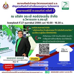 เยี่ยมชมดูงาน ณ บริษัท จระเข้ คอร์ปอเรชั่น จำกัด (โรงงาน อ.วิหารแดง จ.สระบุรี) ในวันพฤหัสบดี ที่ 27 กุมภาพันธ์ 2568 เวลา 10.00 – 16.30 น. ช่วงเช้า รับฟังการแชร์ประสบการณ์ หัวข้อ ” บริษัทคนไทย ก้าวสู่ทศวรรษ ที่ 4 เติบโตก้าวกระโดด ” และให้ความรู้เรื่อง Branding โดยคุณศุภพงษ์ เพชรสุทธิ์ ประธานกรรมการบริหารและ กรรมการผู้จัดการใหญ่ Neer 15 ช่วงบ่าย ทำกิจกรรม CSR ร่วมกับบริษัท จระเข้ ฯ ทาสีศูนย์การศึกษาพิเศษ ประจำจังหวัดสระบุรี หน่วยบริการวิหารแดง สนใจสมัครได้ที่สมาคมศิษย์เก่าคณะวิศวฯ Tel/Line : 0832641951 ปิดรับสมัคร วันที่ 15 ก.พ. 68 ด่วน!!! รับจำนวนจำกัด ค่าสมัครเพียง 300 บาท รับเสื้อโครงการฟรี!!! https://shorturl.asia/RUJ25