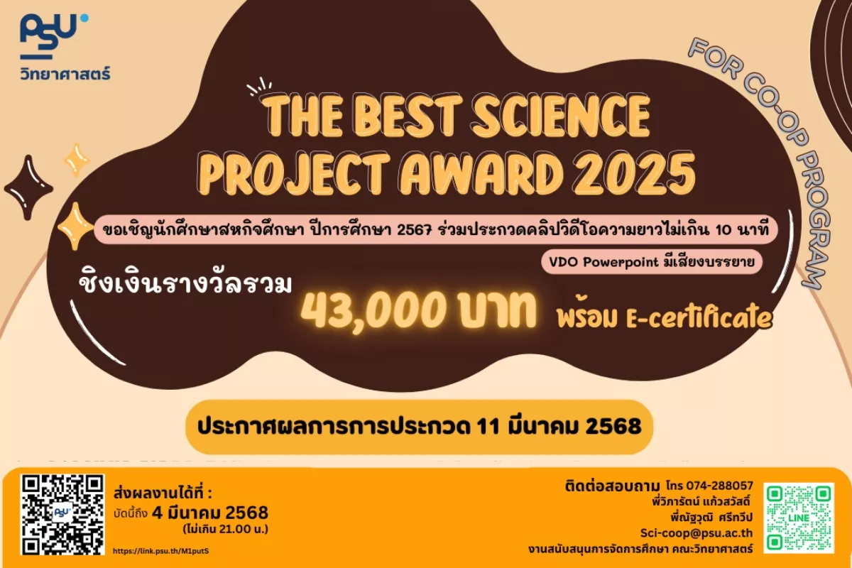 คณะวิทยาศาสตร์ มหาวิทยาลัยสงขลานครินทร์ ขอเชิญนักศึกษาสหกิจศึกษา ปีการศึกษา 2567 เข้าร่วมการประกวด “The Best Science Project Award 2025” เพื่อแสดงไอเดียสุดสร้างสรรค์ผ่านคลิปวิดีโอความยาวไม่เกิน 10 นาที ชิงเงินรางวัลรวม 43,000 บาท พร้อม E-Certificate รูปแบบผลงาน คลิปวิดีโอ PowerPoint พร้อมเสียงบรรยาย