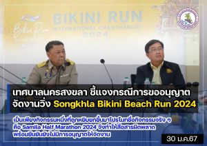 นายวันชัย ปริญญาศิริ นายกเทศมนตรีนครสงขลา กล่าวว่า เทศบาลนครสงขลา ได้รับหนังสือการขออนุญาตใช้พื้นที่ในการจัดกิจกรรม Songkhla Bikini Beach Run 2024 จากชมรมเดิน วิ่ง ปั่น ผู้สื่อข่าวสิ่งแวดล้อมและการอนุรักษ์ธรรมชาติ ภาคใต้ เมื่อวันที่ 24 มกราคมที่ผ่านมา จึงยังไม่ได้มีการอนุญาตตามที่เป็นข่าวแต่อย่างใด ซึ่งจากการพูดคุยกับผู้จัดกิจกรรมฯ ได้ให้รายละเอียดว่า…เป็นการจัดงานเดิน- วิ่ง ริมชายหาด เพื่อโปรโมทส่งเสริมการท่องเที่ยวในจังหวัดสงขลา และเป็นการกระตุ้นเศรษฐกิจในพื้นที่เท่านั้น ซึ่งจากกรณีดังกล่าวอาจมีความคลาดเคลื่อนในการสื่อสารประชาสัมพันธ์การจัดกิจกรรมฯ ที่ได้หยิบยกประเภทการแข่งขันเพียงหนึ่งประเภทมาโปรโมท