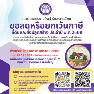 เทศบาลนครหาดใหญ่ เปิดรับลงทะเบียนขอลดหรือยกเว้นภาษีที่ดินและสิ่งปลูกสร้าง ประจำปี พ.ศ.2569 จึงขอแจ้งให้ผู้เสียภาษีที่ได้รับผลกระทบจากเหตุอุทกภัย และประสงค์จะขอลดหรือยกเว้นภาษีที่ดินและสิ่งปลูกสร้าง มาลงทะเบียนแจ้งรายชื่อรายละเอียดความเสียหายของที่ดินและสิ่งปลูกสร้าง โดยลงทะเบียนผ่าน QR Code หรือ มาลงทะเบียนด้วยตนเอง ณ ห้องประชุมสำนักการศึกษาเทศบาลนครหาดใหญ่ (ตึกหลัง ชั้น 2)