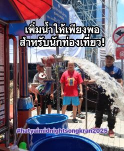เทศบาลนครหาดใหญ่ เพิ่มปริมาณน้ำบริการฟรีให้กับนักท่องเที่ยวชาวไทยและชาวต่างชาติ เพื่อให้เพียงพอต่อการเล่นสาดน้ำ ภายในงานหาดใหญ่มิดไนท์สงกรานต์ 2025 รวมถึงเจ้าหน้าที่จากการประปาส่วนภูมิภาคหาดใหญ่ ได้ดำเนินการแก้ไข ติดตั้งมิเตอร์หัวจ่ายน้ำประปา ให้หัวรับน้ำประปาสามารถต่อตรงเข้ารถดับเพลิงได้ ประจำจุดบริเวณถนนเสน่หานุสรณ์
