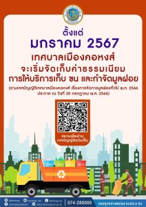 เทศบาลเมืองคอหงส์จะเริ่มจัดเก็บค่าธรรมเนียมการให้บริการเก็บ ขน และกำจัดขยะมูลฝอย (ตามเทศบัญญัติเทศบาลเมืองคอหงส์ เรื่องการจัดการมูลฝอยทั่วไป พ.ศ. 2566 ประกาศ ณ วันที่ 20 กรกฎาคม พ.ศ. 2566)