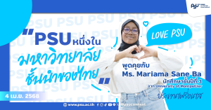 : ประสบการณ์ที่นี่ยอดเยี่ยมมากจริง ๆ ในอนาคตหากมีนักศึกษาจากมหาวิทยาลัยของฉันมายัง PSU ฉันจะพยายามแบ่งปันประสบการณ์เพื่อช่วยให้พวกเขาปรับตัวได้ง่ายขึ้น อยากฝากถึงนักศึกษาว่าอย่ากลัวที่จะเข้าหาผู้คน ต้องอดทนใช้เวลาปรับตัว และอย่าคาดหวังว่าจะรู้สึกเหมือนอยู่บ้านภายใน 1 เดือน แต่เมื่อคุณคุ้นเคยแล้ว มันอาจเป็นหนึ่งในประสบการณ์ที่ดีที่สุดในชีวิตของคุณเลยก็ว่าได้