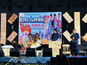 วันที่ 11 ตุลาคม 2568 เวลา 21.30 น. ณ เวทีกลางบริเวณหน้าที่ว่าการอำเภอหาดใหญ่ จังหวัดสงขลา นายเอก ยังอภัย ณ สงขลา นายอำเภอหาดใหญ่ มอบของรางวัลให้แก่ผู้เข้าร่วมงานในกิจกรรม “แจกรางวัลจริง คืนความสุขให้ประชาชน” ภายในงานประเพณีลากพระ อำเภอหาดใหญ่ ครั้งที่ 1 ประจำปี 2568 สร้างบรรยากาศแห่งความสุขและรอยยิ้มให้กับประชาชนที่มาร่วมงานอย่างคึกคัก ในการนี้ มี นางมุกดา ยังอภัย ณ สงขลา ประธานแม่บ้านมหาดไทยอำเภอหาดใหญ่ และ นางสาวปิยพัชร์ วุ่นดำ ปลัดอำเภอหัวหน้ากลุ่มงานบริหารงานปกครอง ร่วมมอบของรางวัลให้แก่ผู้โชคดีที่เข้าร่วมกิจกรรม โดยของรางวัลประกอบด้วยหมอน พัดลม จักรยาน และเครื่องใช้ไฟฟ้าหลากหลายรายการ