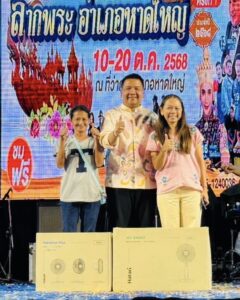 วันที่ 12 ตุลาคม 2568 เวลา 21.30 น. ณ เวทีกลางบริเวณหน้าที่ว่าการอำเภอหาดใหญ่ จังหวัดสงขลา นายเอก ยังอภัย ณ สงขลา นายอำเภอหาดใหญ่ มอบของรางวัลให้แก่ผู้เข้าร่วมงานในกิจกรรม “แจกรางวัลจริง คืนความสุขให้ประชาชน” ภายในงานประเพณีลากพระ อำเภอหาดใหญ่ ครั้งที่ 1 ประจำปี 2568 ท่ามกลางบรรยากาศแห่งความสุข ความสนุกสนาน และเสียงหัวเราะของประชาชนที่มาร่วมงานอย่างคึกคัก โดยมีรางวัลหลากหลายรายการ อาทิ หมอน พัดลม จักรยาน และเครื่องใช้ไฟฟ้าอีกหลายชนิด มอบให้แก่ผู้โชคดีที่ลงทะเบียนร่วมกิจกรรมด้วยบรรยากาศเป็นกันเอง เต็มไปด้วยเสียงปรบมือและรอยยิ้มจากพี่น้องประชาชน
