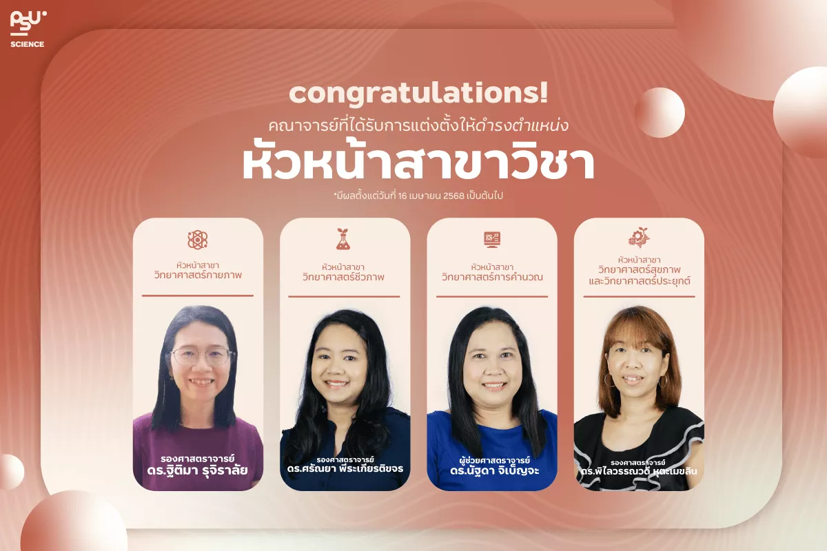 คณะวิทยาศาสตร์ มหาวิทยาลัยสงขลานครินทร์ ขอแสดงความยินดีและขอให้กำลังใจแก่คณาจารย์ที่ได้รับการแต่งตั้งให้ดำรงตำแหน่งหัวหน้าสาขาวิชา ตามคำสั่งคณะวิทยาศาสตร์ มหาวิทยาลัยสงขลานครินทร์ เลขที่ 0099/2568 เรื่อง การแต่งตั้งหัวหน้าสาขาวิชา คณะวิทยาศาสตร์ ดังนี้