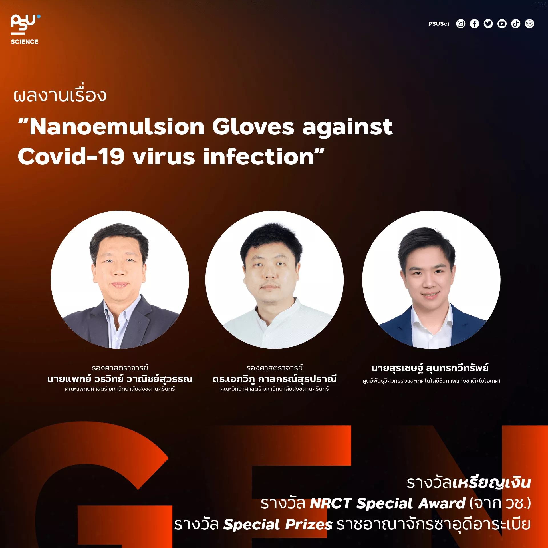 ผลงานวิจัยที่ได้รับรางวัลเหรียญเงิน, รางวัล NRCT Special Award จากวช. และรางวัล Special Prizes ราชอาณาจักรซาอุดีอาระเบีย ในครั้งนี้คือ ผลงานเรื่อง “Nanoemulsion Gloves against Covid-19 virus infection” โดยมีนักวิจัยในโครงการคือ