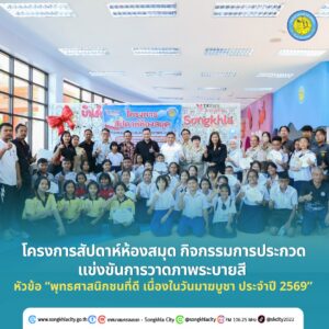 วันนี้ (2 มีนาคม 2569) ณ อุทยานการเรียนรู้นครสงขลา นายวันชัย ปริญญาศิริ นายกเทศมนตรีนครสงขลา มอบหมายให้นายดนุพล สุนทรัตน์ รองนายกเทศมนตรีนครสงขลา เป็นประธานในพิธีมอบรางวัลการประกวดแข่งขันการวาดภาพระบายสี ในโครงการสัปดาห์ห้องสมุด กิจกรรมการประกวดแข่งขันการวาดภาพระบายสี หัวข้อ “พุทธศาสนิกชนที่ดี เนื่องในวันมาฆบูชา ประจำปี 2569” โดยมีหัวหน้าส่วนราชการ ผู้อำนวยการสถานศึกษา คณะครู และนักเรียนเข้าร่วมอย่างพร้อมเพรียง
