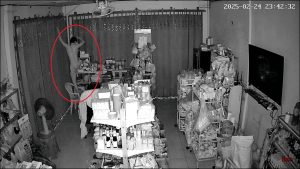 ผู้สื่อข่าวตรวจสอบภาพจากกล้องวงจรปิดพบว่า ในช่วงเวลาประมาณ 23.30 น.คนร้ายเป็นชายหุ่นผอม นุ่งกางเกงขาสั้นไม่สวมเสื้อ กำลังก้มๆเงยอยู่ที่บริเวณลิ้นชักเก็บเงิน สักครู่เดียวก็ขึ้นยืนบนเก้าอี้ เหยียบชั้นวางของและจับขอบประตูเหล็กยืดและป่ายปีนท่าทางเหมือนฮีโร่หนังสไปเดอร์แมน มุดฝ้าเพดานกลับไป