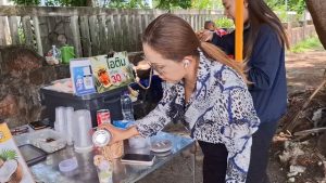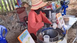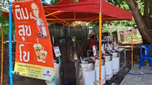 หรือจะคละรสชาติกันก็ได้ ก็ยังคงขายแก้วละ 30 บาทอยู่เหมือนเดิม เนื่องจากในวันนี้ มีลมกรรโชกแรง ทำให้ต้องใช้ผ้าพลาสติกมาห่อหุ้มถังบังลม เพื่อป้องกันไม่ให้ไอติมละลายเร็ว กว่าปกติ สำหรับไอติมกะทิสด สูตรโบราณ เป็นสูตรของเพื่อนที่ปัตตานีให้สูตรมา แบรนด์เป็นไอติม p&p กะทิสดที่ปัตตานี ที่อยู่ตรงข้ามกับสถานสงเคราะห์เด็กที่ปัตตานี รับรองความอร่อย ก็อยากให้ทุกคน ได้กินได้ลอง ได้ลิ้มรส ทำแล้วมีความสุข ร้านไอติม “ติมสุขโข” รับทำทุกเทศกาล สั่งล่วงหน้าอย่างน้อย 2 วัน ได้ที่หมายเลข 094 7038145