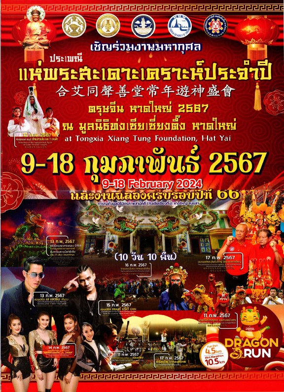 มูลนิธิมิตรภาพสามัคคี(ท่งเซียเซี่ยงตึ๊ง)หาดใหญ่ จัดงานมหากุศลแห่พระสะเดาะเคราะห์ประจำปี ฉลองตรุษจีนหาดใหญ่ 9 - 18 กุมภาพันธ์ 2567 10 วัน 10 คืน สนับสนุนโดย การท่องเที่ยวแห่งประเทศไทย , กระทรวงการท่องเที่ยวและกีฬา , จังหวัดสงขลา , เทศบาลนครหาดใหญ่