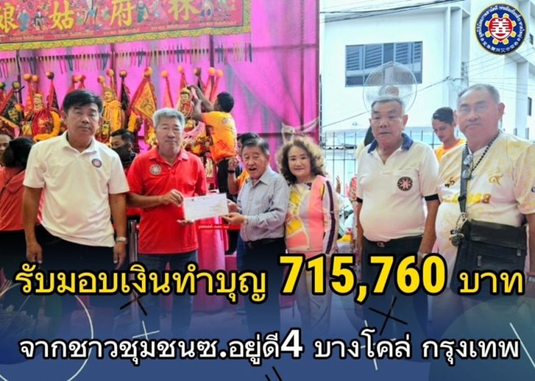 มอบเงินทำบุญจำนวน 715,760 บาท เพื่อถวายแด่องค์หลวงปู่ไต้ฮงโจวซือ องค์ฮกเต็กแป๊ะกง องค์เจ้าแม่ลิ้มกอเหนี่ยวและองค์เทพนาจาไท้จื้อ (เทพโกมินทร์)