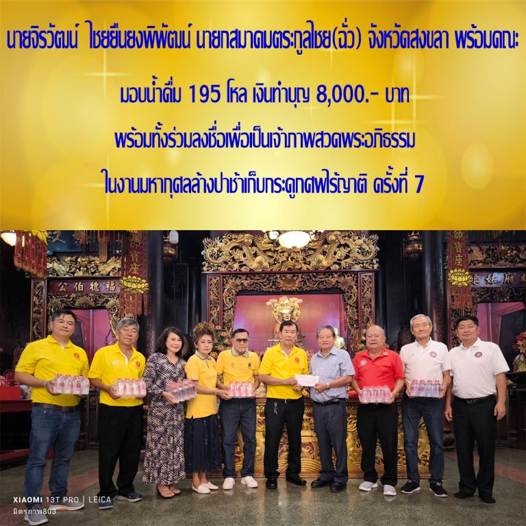 นายกสมาคมตระกูลไชย(ฉั่ว) จังหวัดสงขลา พร้อมทั้งคณะ ได้มอบน้ำดื่มจำนวน 195 โหล เงินทำบุญจำนวน 8,000.- บาท