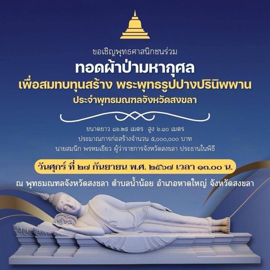 เทศบาลนครหาดใหญ่ ขอเชิญพุทธศาสนิกชนร่วมทอดผ้าป่ามหากุศลเพื่อสมทบทุนสร้าง พระพุทธรูปปางปรินิพพานประจำพุทธมณฑลจังหวัดสงขลา ขนาดยาว 16.25 เมตร สูง 6.10 เมตร ประมาณการก่อสร้างจำนวน 5,000,000 บาท ในวันศุกร์ ที่ 27 กันยายน พ.ศ. 2567 เวลา 13.00 น. ณ พุทธมณฑลจังหวัดสงขลา ตำบลน้ำน้อย อำเภอหาดใหญ่ จังหวัดสงขลา
