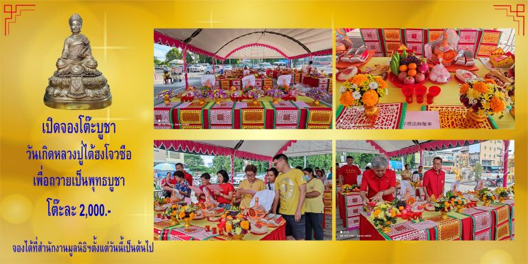 มูลนิธิมิตรภาพสามัคคี(ท่งเซียเซี่ยงตึ๊ง) หาดใหญ่ จะมีพิธีนมัสการวันคล้ายวันสมภพองค์หลวงปู่ไต้ฮงโจวซือ ในวันศุกร์ที่ 29 พฤศจิกายน 2567 ที่จะถึงนี้ จึงขอเชิญชวนสาธุชนทุกท่าน ทั้งสายไหว้พระทั้งหลาย สายมู ร่วมจองโต๊ะชุดไหว้เพื่อถวายเป็นพุทธบูชาให้กับองค์หลวงปู่ไต้ฮงโจวซือ ในราคาโต๊ะละ 2,000.- บาท