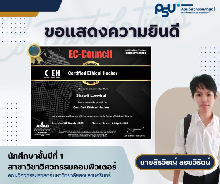 ขอแสดงความยินดีกับนักศึกษาชั้นปีที่ 1 นายสิรวิชญ์ ลอยวิรัตน์ สาขาวิชาวิศวกรรมคอมพิวเตอร์ ได้รับใบรับรอง ประกาศนียบัตร EC-Council CEH ตามมาตรฐานในระดับสากล