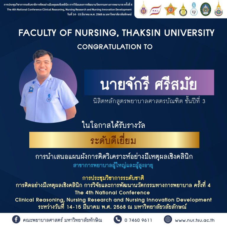 ขอแสดงความยินดีกับนิสิตคณะพยาบาลศาสตร์ มหาวิทยาลัยทักษิณ คว้า 24 รางวัล ในการประกวดผลงานวิชาการระดับชาติ The 4th National Conference Clinical Reasoning, Nursing Research and Nursing Innovation Development ระหว่าง 14-15 มีนาคม 2568 ณ มหาวิทยาลัยวลัยลักษณ์ ประกอบด้วย