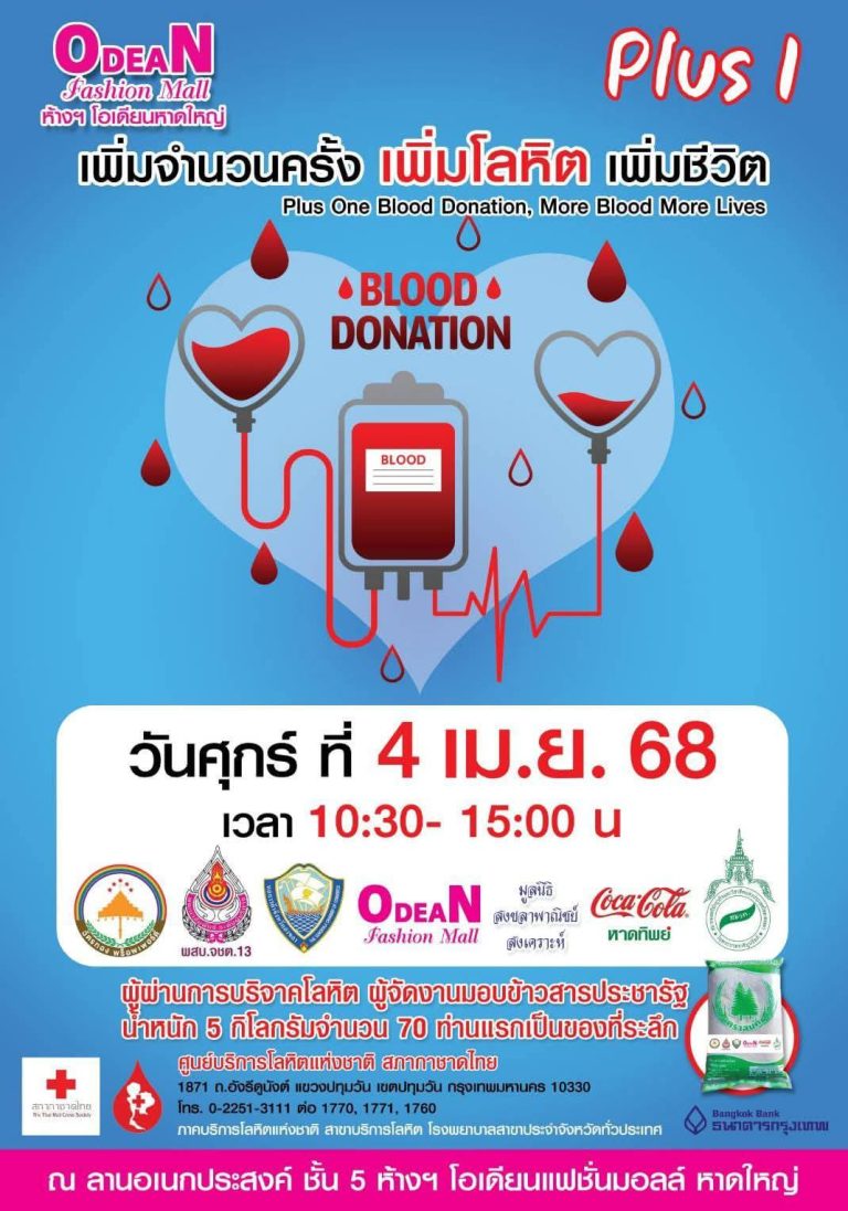 เตรียมร่างกายให้พร้อมวันศุกร์ที่ 4 เม.ย. 2568 เชิญร่วมบริจาคโลหิตที่ชั้น 5 เวลา 10:30 - 15:00 น. โดยผู้จัดมอบข้าวสารประชารัฐ 5 กก.จำนวน 70 คน เป็นของที่ระลึก สนับสนุนกิจกรรมโดยเหล่ากาชาดจังหวัดสงขลา,โรงพยาบาลหาดใหญ่,ห้างฯโอเดียนหาดใหญ่,หอการค้าจังหวัดสงขลา,มูลนิธิสงขลาพาณิชย์สงเคราะห์,บริษัทหาดทิพย์ จำกัด (มหาชน),บริษัทฉัตรทองพร็อพเพอร์ตี้ จำกัด,สธวท.สงขลา,พสบ. จชต.13 ขอบคุณนะครับ