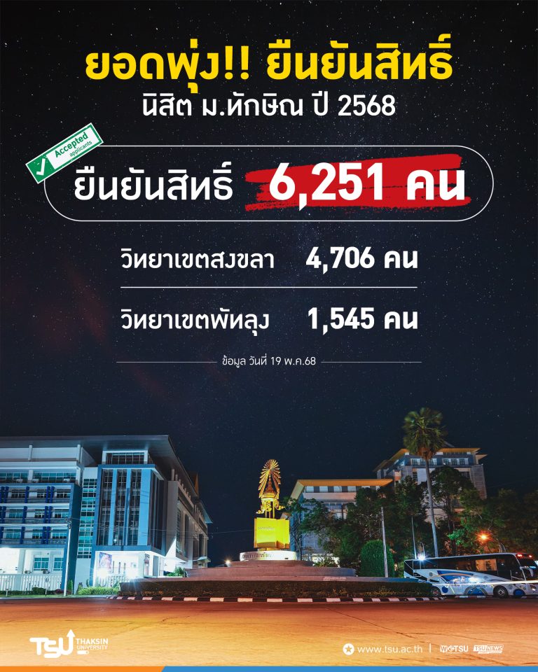 มหาวิทยาลัยทักษิณได้รับการตอบรับอย่างล้นหลามจากน้อง ๆ #DEK68 โดยมีผู้ยืนยันสิทธิ์เข้าศึกษาแล้วทั้งสิ้น 6,251 คน จากจำนวนยอดผู้สมัครทั้งหมด 24,526 คน โดยแบ่งเป็น