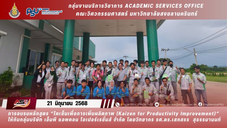 วันที่ 21 มิถุนายน 2568 กลุ่มงานบริการวิชาการ วิศวฯ ม.อ. ได้จัดอบรมหลักสูตร “ไคเซ็นเพื่อการเพิ่มผลิตภาพ (Kaizen for Productivity Improvement)“ ให้กับบุคลากรของกลุ่มบริษัท เอ็มพี แอพคอน โอเปอร์เรชั่นส์ จำกัด จำนวน 35 คน