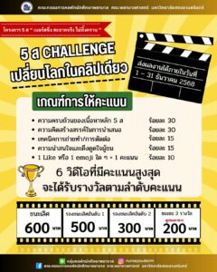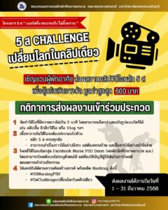 กติกา: เล่าเรื่อง 5 ส อย่างครบถ้วน เข้าใจง่าย โพสต์คลิปลง Facebook Nurse PSU Dorm (ตั้งค่าสาธารณะ) พร้อมติด Hashtag: