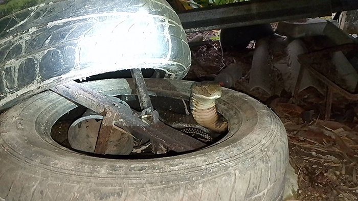 อสรพิษร้ายเข้าบ้าน ชาวบ้านแห่ส่องเลขเด็ด งูจงอาง ยาวเกือบ 4 เมตร