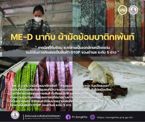 เทคนิคที่ทับซ้อน ลวดลายเป็นเอกลักษณ์โดดเด่นจนได้รับการคัดสรรเป็นสินค้า OTOP ของตำบล ระดับ 5 ดาว ” “ME-D นาทับ ผ้ามัดย้อมบาติกเพ้นท์“ ตำบลนาทับ อำเภอจะนะ จังหวัดสงขลา นับเป็นอีกหนึ่งผลิตภัณฑ์ชุมชนที่มีความสวยงามและมีเสน่ห์เฉพาะตัวไม่เหมือนใคร ด้วยวิธีการมัดย้อมและการเล่นสี ทั้งสีธรรมชาติ และสีเคมีที่ได้มาตรฐานจากความชำนาญและประสบการณ์ที่มีมาอย่างยาวนาน รวมถึงลวดลายที่เป็นเอกลักษณ์ ทำให้สินค้าได้รับมาตรฐานผลิตภัณฑ์ชุมชนและยกระดับให้กลายเป็นสินค้า OTOP ของตำบล ระดับ 5 ดาว